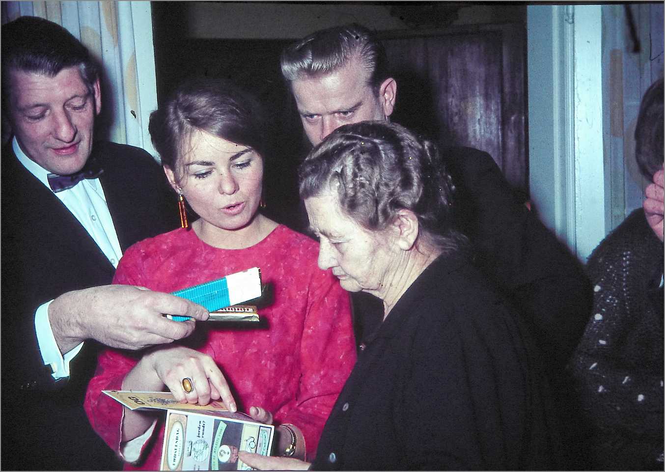 Andreas 80 års fødselsdagsfest 1967. Hugo Berg, Vita, Hans og Andrea studerer et fødselsdagskort.