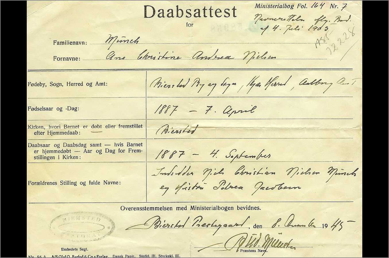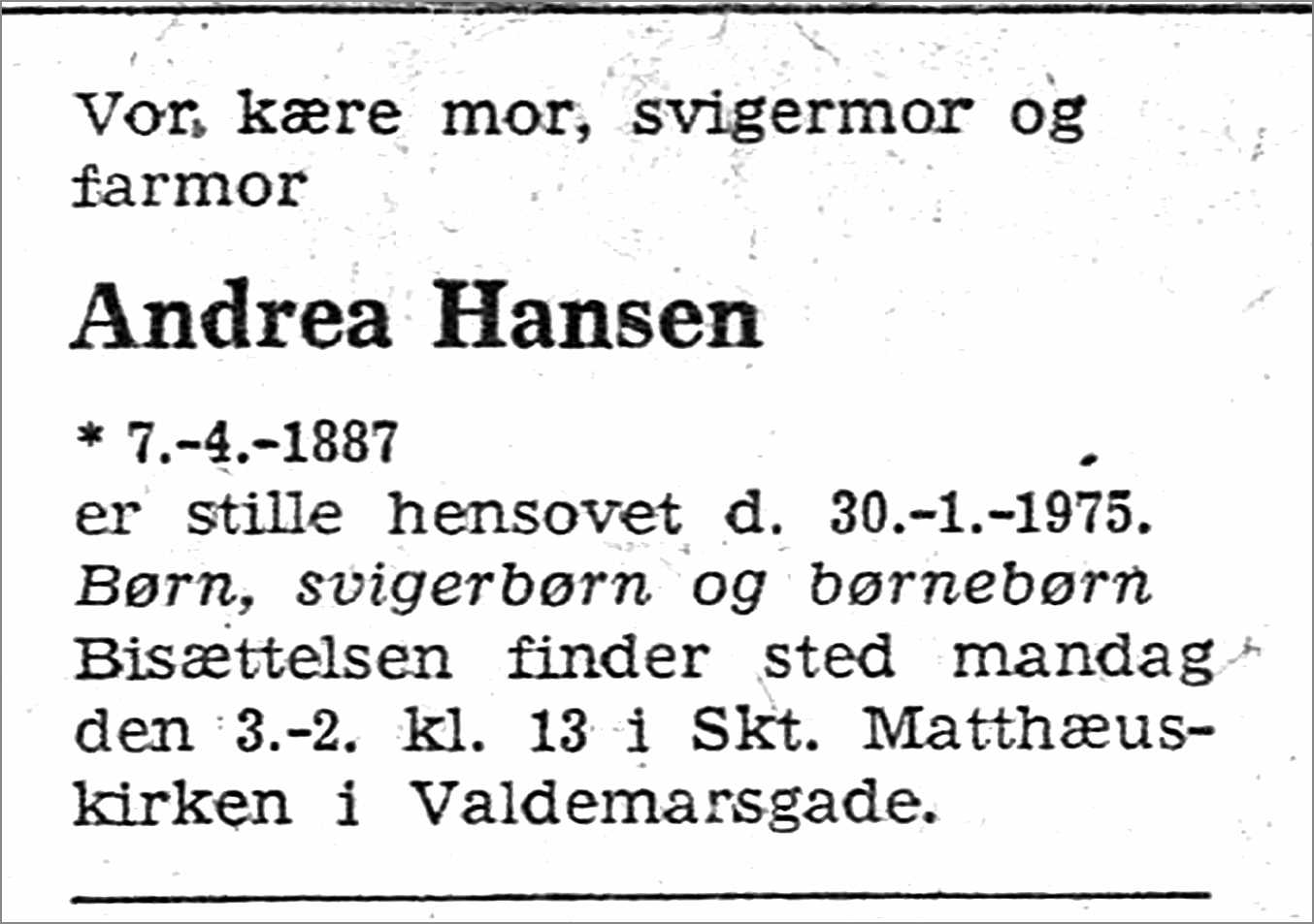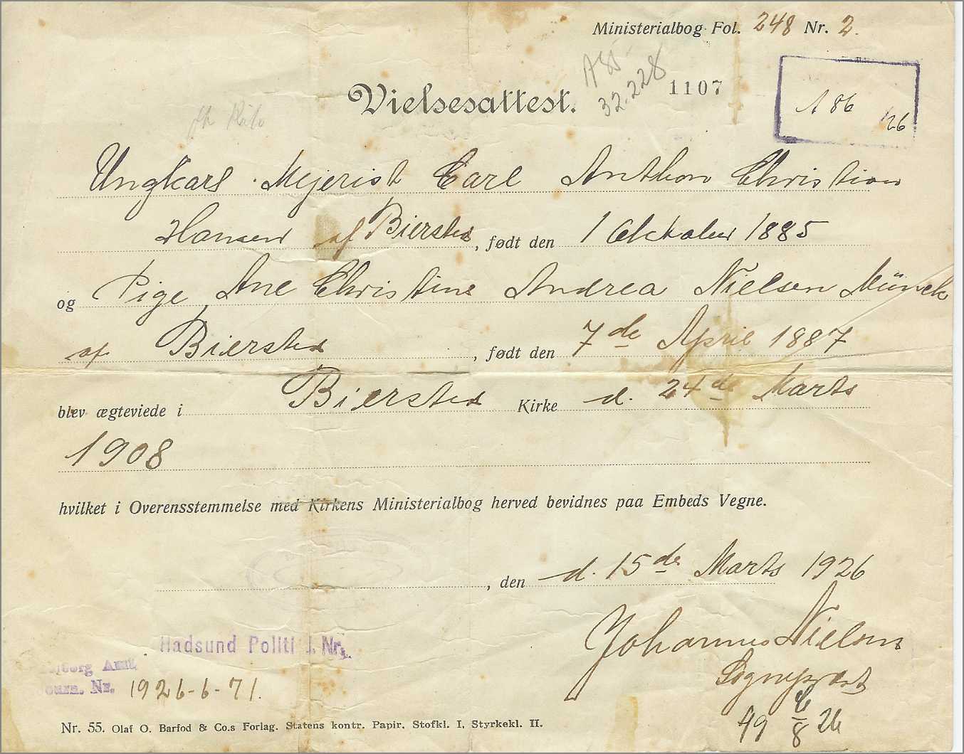 Andrea blev forlovet med Mejerist Carl Anthon Christian Hansen (født 1/10 1885) også fra Biersted.