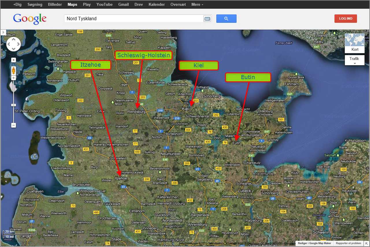 Opholdssteder for Carl, Andrea og Svend i 1920'erne iflg. Svends sang (forrige billede) er her markeret, samt byen Izehoe hvor deres hotel vist lå.