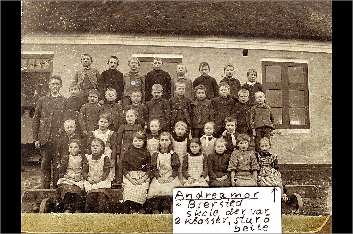 Hans skriver: Andrea (over pilen) i Biersted Skole hvor der var 2 klasser: 'stur å bette'.