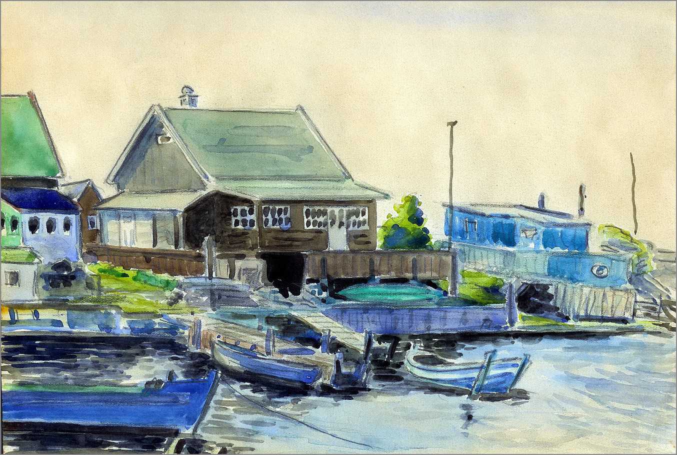 Akvarel af Viktor visende Andreas hus (helt til venstre) og Svends hus (i midten) set fra vandsiden.
