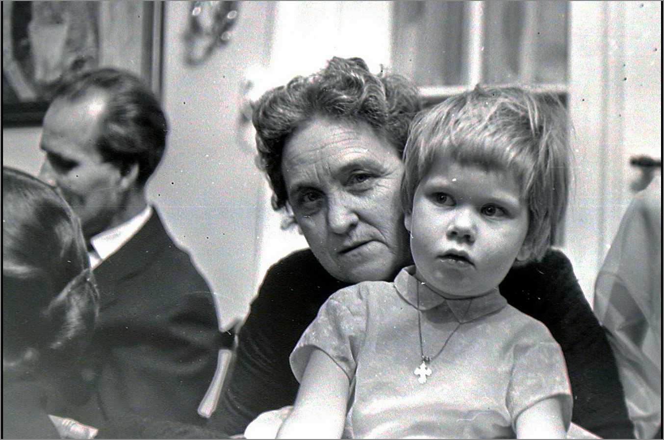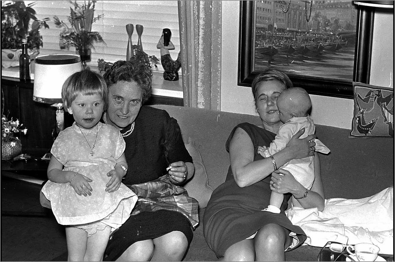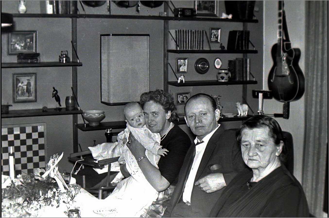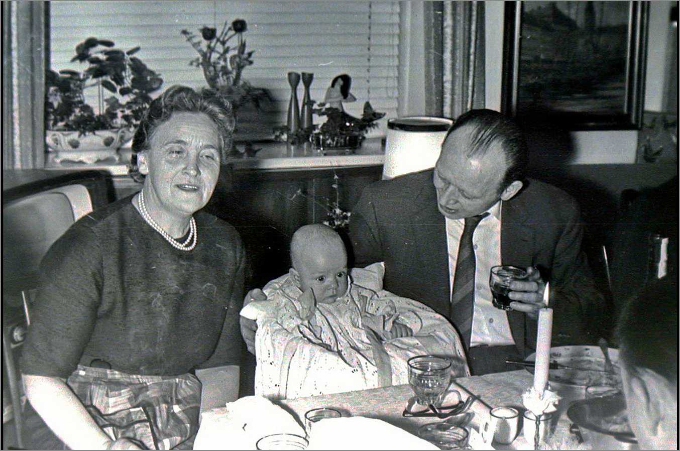 Barnedåb. Gudrun og Viktor flankerer barnebarnet Michael. Svend og Ruth lægger lokaler til i Ahlefeldtsgade