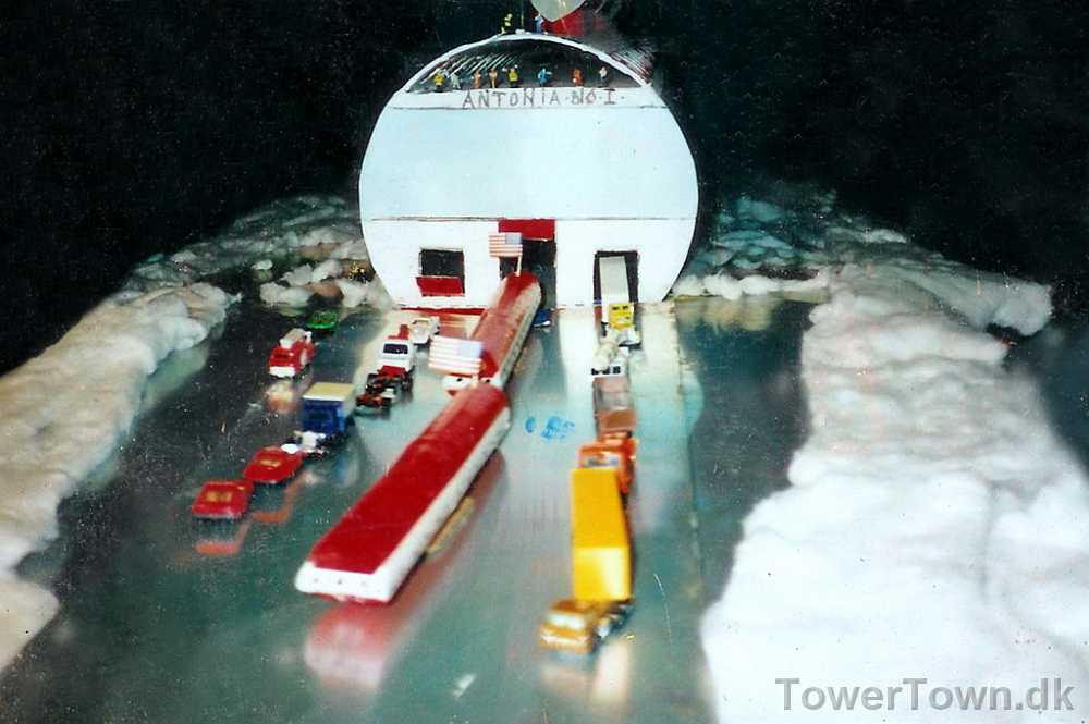 'Antonia No.1' er et kæmpe moderskib til transport af husbåde i midterkanalen samt køretøjer i siderne.