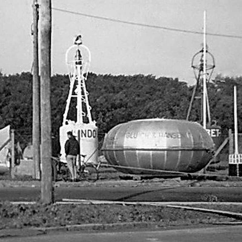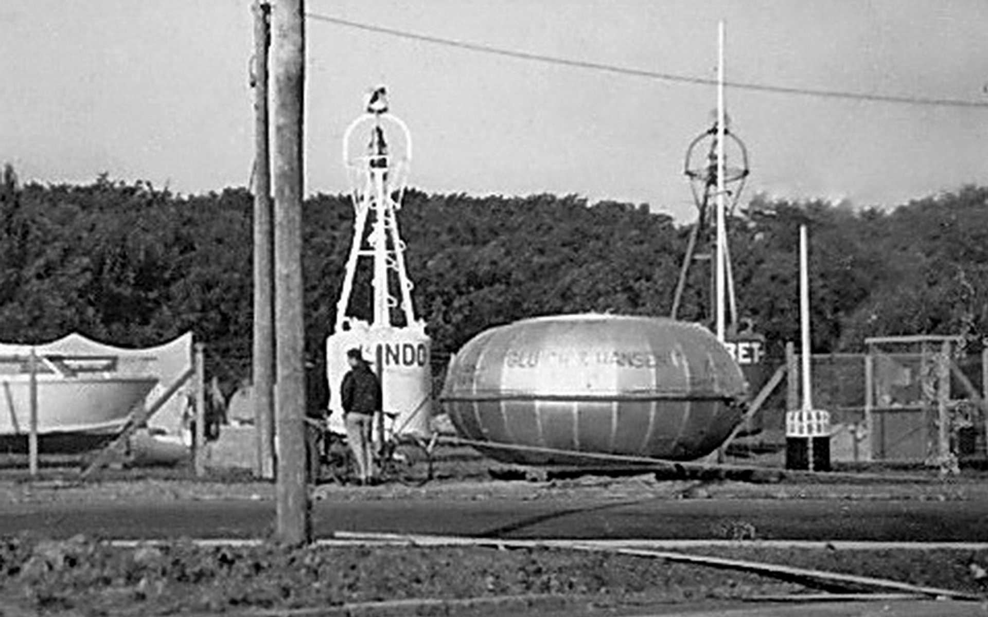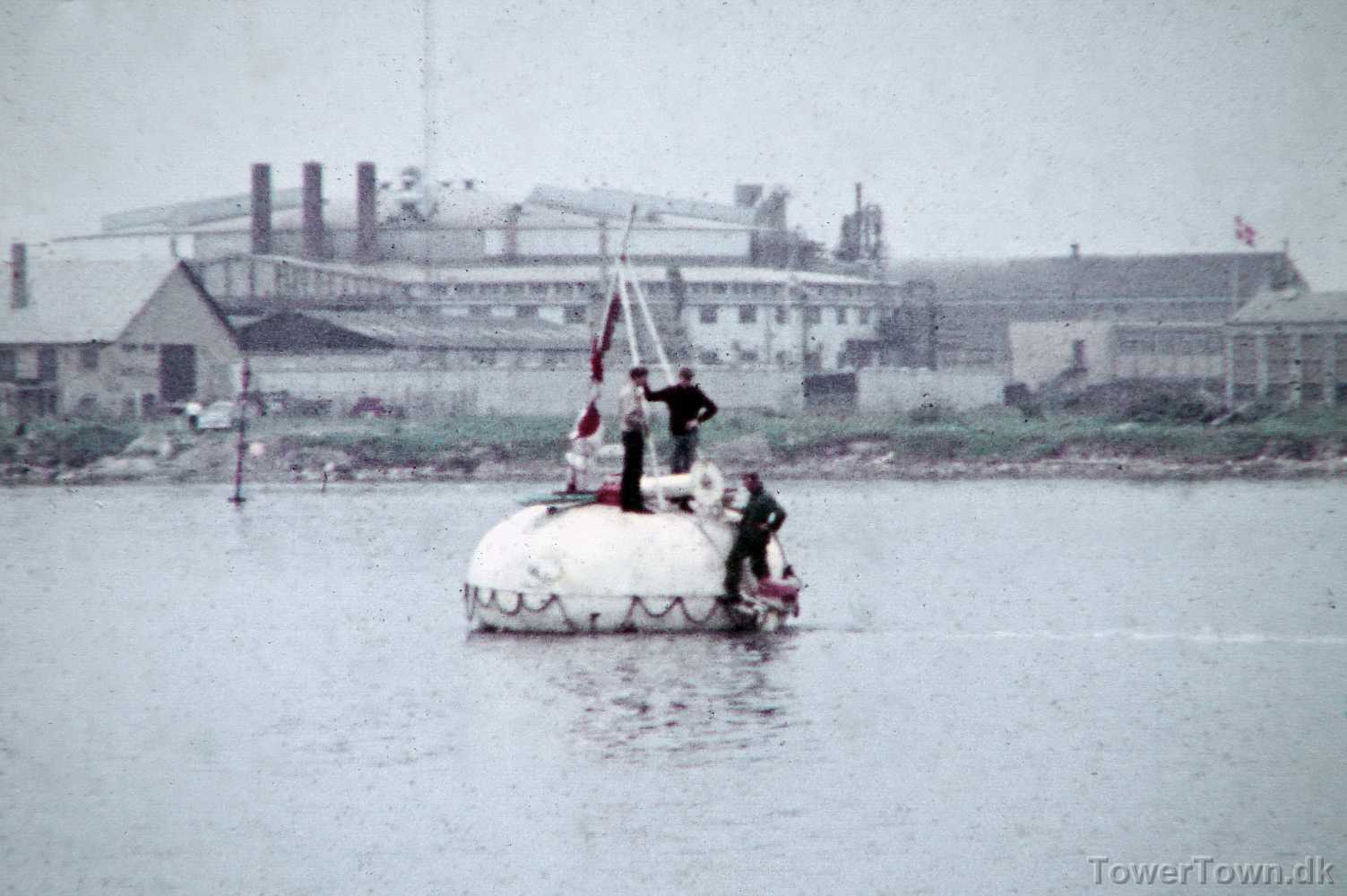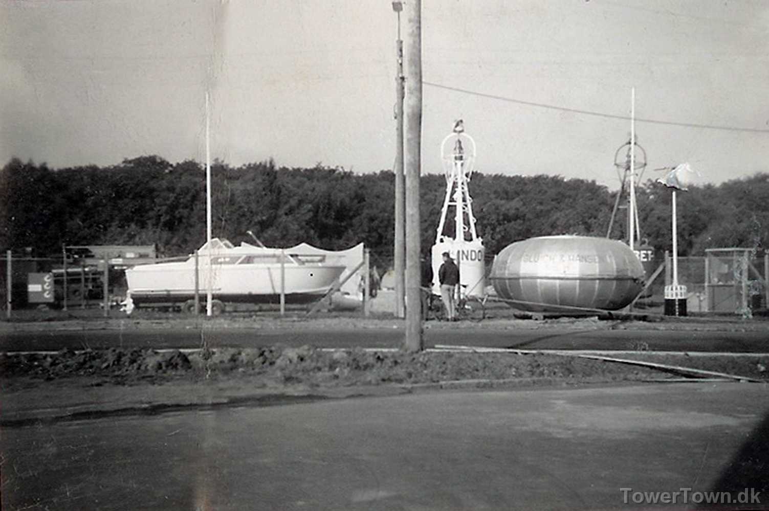 Til højre ses Anton's bud på en redningskabine til store skibe på udstilling i Odense 1962.